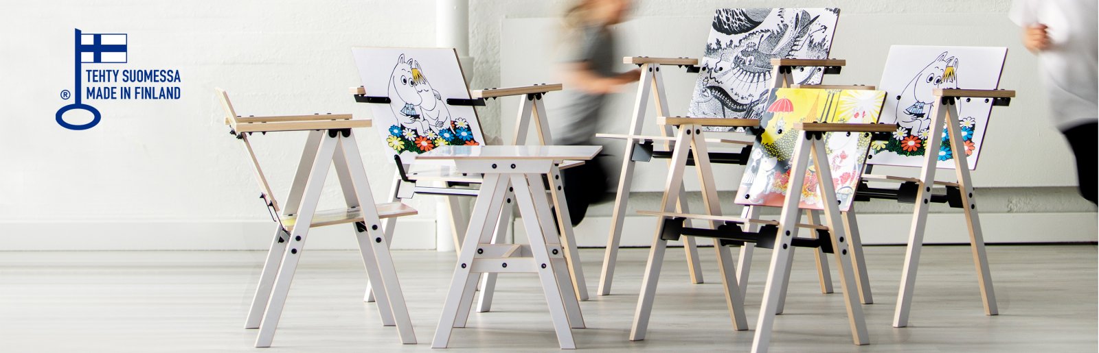 Muumien sanoma rakkaudesta, vapaudesta ja oman elämänpolun löytämisen rohkeudesta tuskin voisi olla ajankohtaisempi. ”Pandemian jälkeisessä ajassa kaikki toivo, tuki ja rakkaus on tarpeen” sanoo kuraattori Isa Kukkapuro. Lasten tuolin kuvituksen lause ”Kaik´ onkin vaarat vältetyt, he kotiin saapuneet on nyt” – sellaista helpotuksen tunnetta kaipaamme kaikki. Moomin Furniture -sarjan ajatus on tuoda iloa ja hyvää mieltä koteihin ja julkisiin tiloihin.”