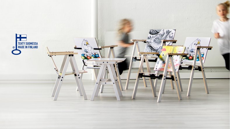 The product line designed by Yrjö Kukkapuro consists of four different products Moomin Chair Large, Moomin Chair Medium, Moomin Chair Small and Moomin Table. The furniture combines timeless and ergonomic design of Yrjö Kukkapuro and joyful and inspiring Moomin illustrations of Tove Jansson.